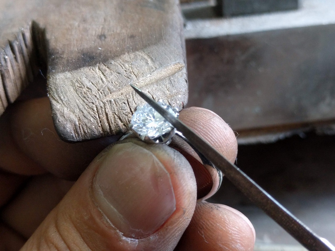 ダイヤの留め Set a diamond 制作 2020.05.24 空枠の指輪にダイヤを留める職人仕事。 1.6ctあるので中々大きく、割ったらエライことです。 笹葉ヤスリで爪の形を整える。 高価なものを預かるので加工の仕事は常にリスクと隣り合わせ・・・ その割に工賃安い! 出来上がり、撮り忘れた。