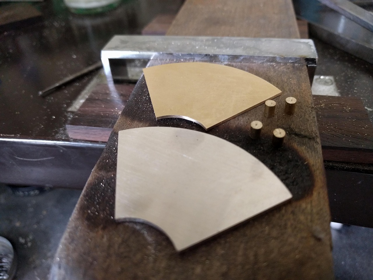 扇面の板を二つ作って長さ4㎜、幅3㎜の丸線を柱にしてくっつける。