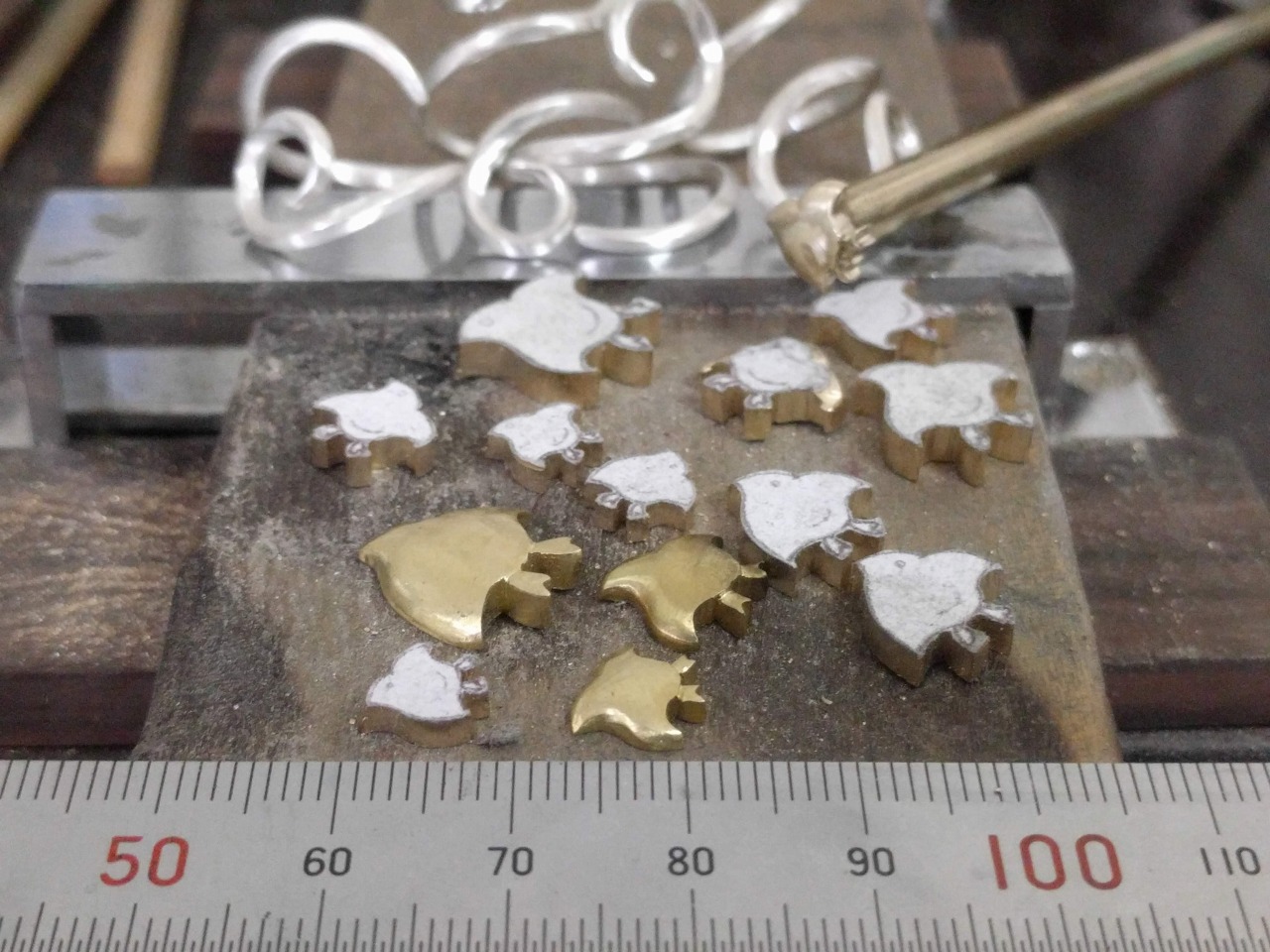 くっつける 制作 2021.09.06 3㎜、2.5㎜、2㎜と、それぞれの厚みの真鍮の板から千鳥のパーツを切り出してヤスリがけ。 結構小さいパーツやと直に手で持ってヤスリがけ出来ないんで何かに固定した方がやりやすい。 というわけで、適当な幅のある棒に固定するとヤスリがけしやすくなるんです。 丸線の棒や角線の棒何でもいい、材質も強力にくっついたら何でもいい。 ただし、後で取れやすいように。 ロウ付けで仮付けすると時間も手間もかかる。 だから、 ↑ アロンアルフアでくっつけてます。 ちょっと火であぶったらすぐ取れてくれる便利なアイテム。