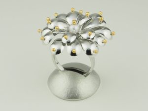 銀,金,アコヤ真珠。指輪に台を作ったのですが、それは選考対象にはなりませんでした。勝手に創作した花です。
