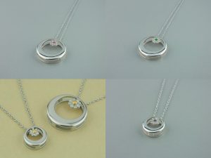 正面から見たときに丸いカタチだけが見えるよう、立体的に作ってチェーンを通しています。初期の作品。