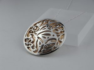 銀製で透かし彫りを下板に板を貼っています。
