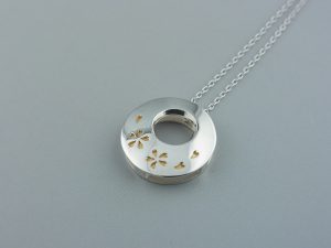 桜が踊るように舞っている感じに見えてほしい。花びら部分は金メッキ。