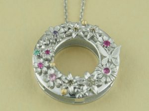 銀、18金、純金粒、エメラルド、ルビー、ピンクサファイア。