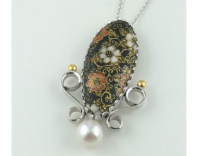 黒地に細かい絵付けが美しい。磁器とアコヤ真珠の組み合わせって、あまりないかもしれません。