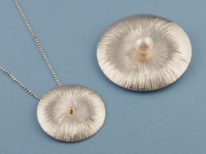 放射状に線を入れて真ん中にはアコヤ真珠と金粒。シイタケみたいになったか…銀