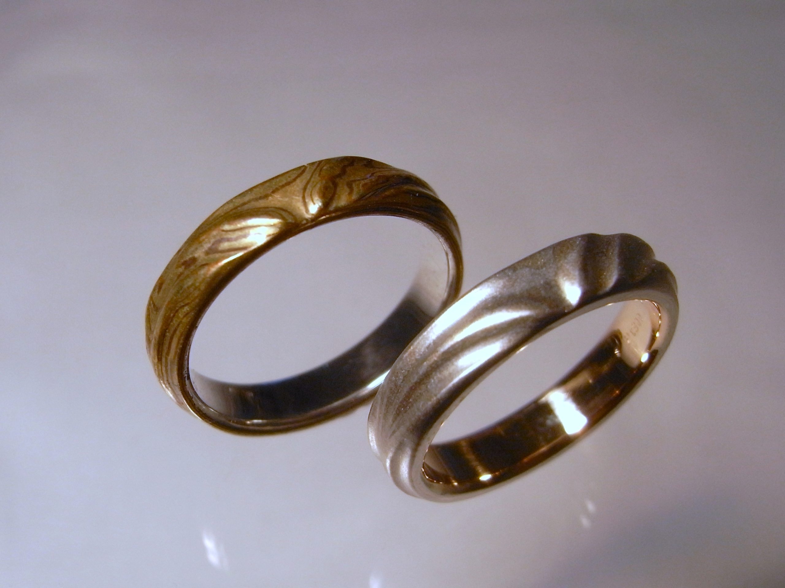 杢目金のマリッジリング I様 杢目金のマリッジリング I様 素材:K18ホワイトゴールド/イエローゴールド 大阪府のお客様 杢目金のマリッジリング I様 素材:K18ホワイトゴールド/イエローゴールド 製作にはかなりの時間を要しました。 拡散接合による杢目金を作り、 そこから叩いて伸ばして曲げて指輪にしていきました。 表面の凹凸は削り出し。 大阪府のお客様