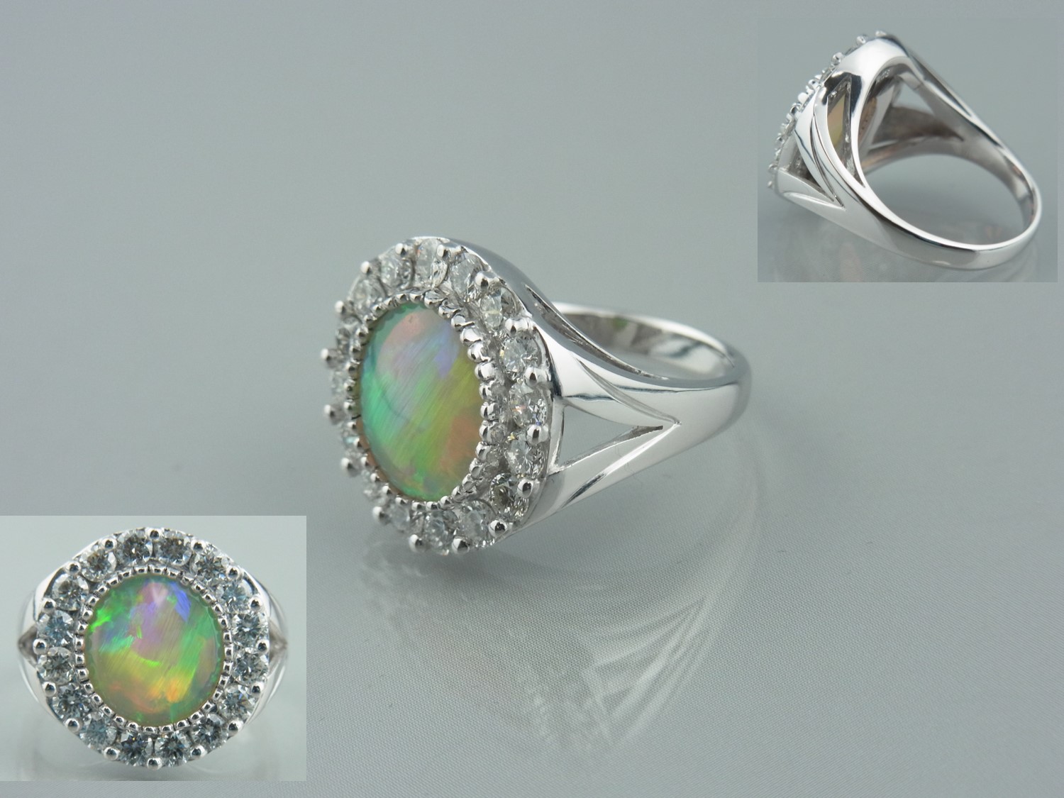 オパールの指輪 オパールの指輪 素材:K18WG,オパール,ダイヤモンド 京都府のお客様 オパールの指輪 素材:K18WG,オパール,ダイヤモンド K18ホワイトゴールドで制作したメレダイヤの取り巻きオパールの指輪です。 極力高さを抑えたシンプルなデザイン。 とてもきれいなオパールです。 京都府のお客様