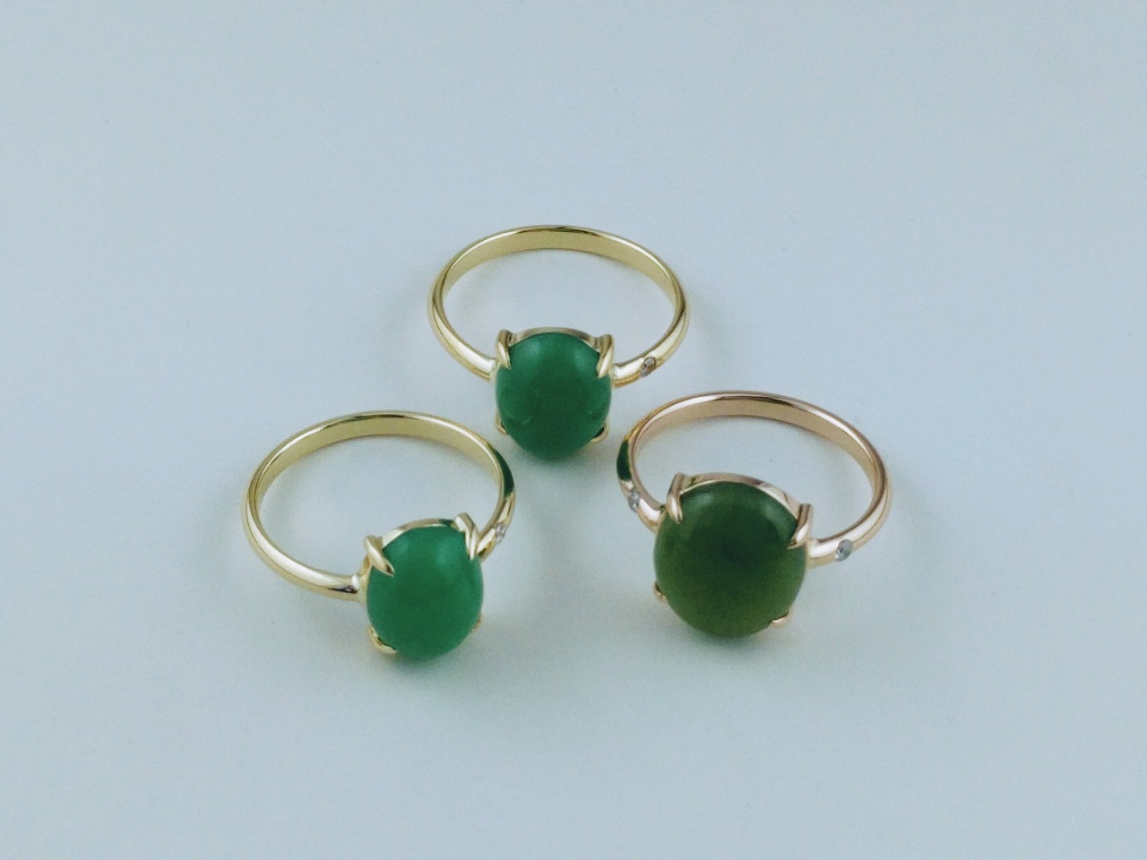 翡翠の指輪 翡翠の指輪 素材:K18,翡翠 大阪府のお客様 翡翠の指輪 素材:K18,翡翠 お預かりしたイヤリング、ペンダントトップから指輪に作り変えました。 2つはイエローゴールド、1つはピンクゴールド。 そこに留まっていたメレダイヤも留めています。 大阪府のお客様