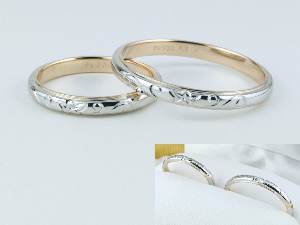 花模様のマリッジリング T様 花模様のマリッジリング T様 素材:Pt900,K18 静岡県のお客様 花模様のマリッジリング T様 素材:Pt900,K18 プラチナとゴールドのコンビで、プラチナ部分の模様ははタガネによる和彫りです。 静岡県のお客様