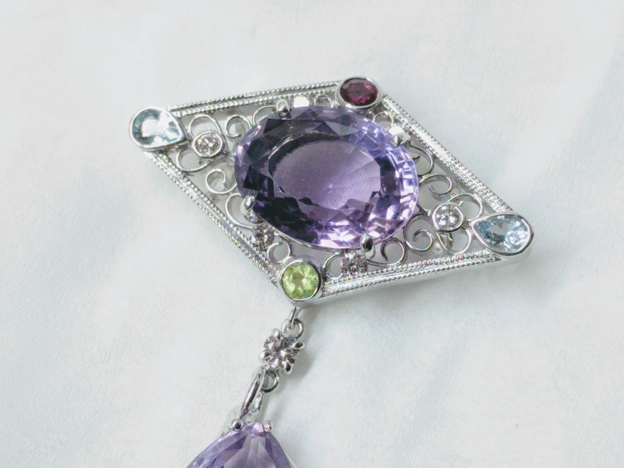 アメシストと天然石のペンダント アメシストと天然石のペンダント 素材:Pt900 大阪府のお客様 アメシストと天然石のペンダント 素材:Pt900 上下左右対称でバランス、配置を意識しながら作っていくので時間がかかりました。 外枠にはミル打ちを施しています。 大阪府のお客様