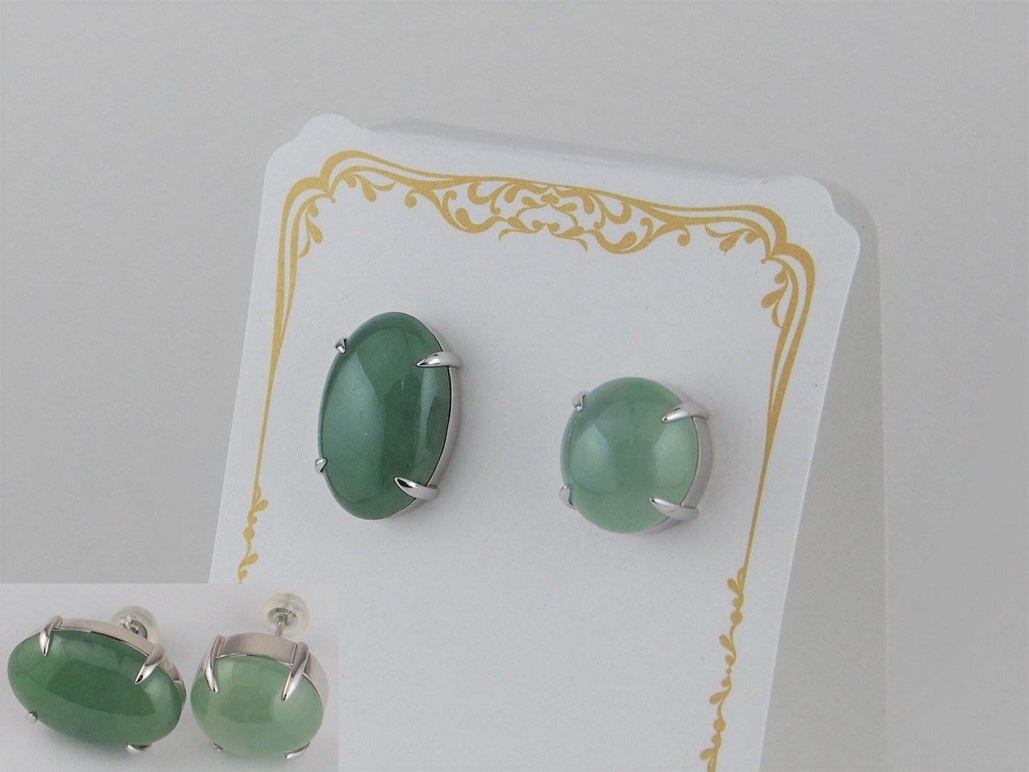 翡翠のピアス 翡翠のピアス 素材:Silver 大阪府のお客様 翡翠のピアス 素材:Silver お預かりした翡翠にぴったりと合う4本爪の石枠を作って留めました。 左右非対称のピアスです。 大阪府のお客様